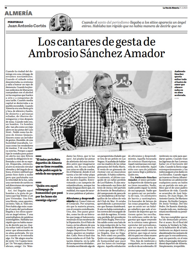 Pero, sobre todas las cosas y trayectoria, Ambrosio Sánchez Amador, ha sido una gran persona. De esas que nada más conocerlas, por su bondad y generosidad, te atrapan por tanto afecto como desprenden. Su cariño y superación, sus valores humanos, dejan una profunda huella entre quienes fuimos sus amigos o conocidos. Y, más en quienes le guiamos en sus primeros pasos en la información deportiva. Todo homenaje es poco para tanto como ha dado al deporte y a los medios de comunicación almerienses.