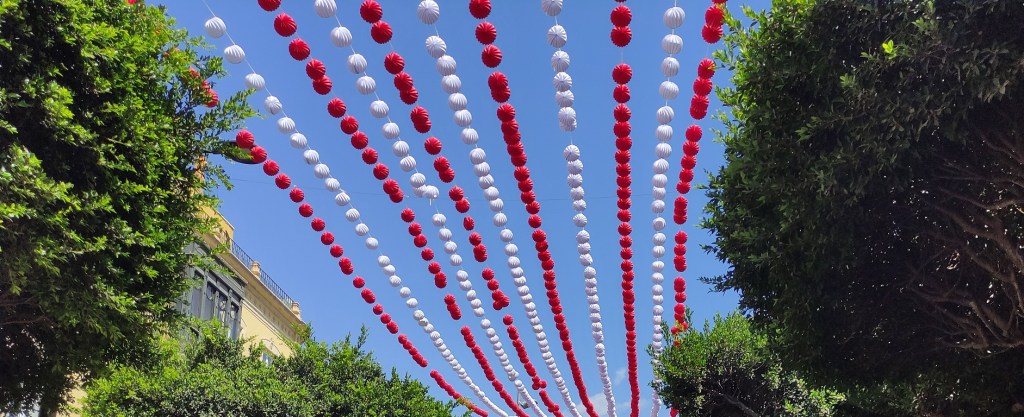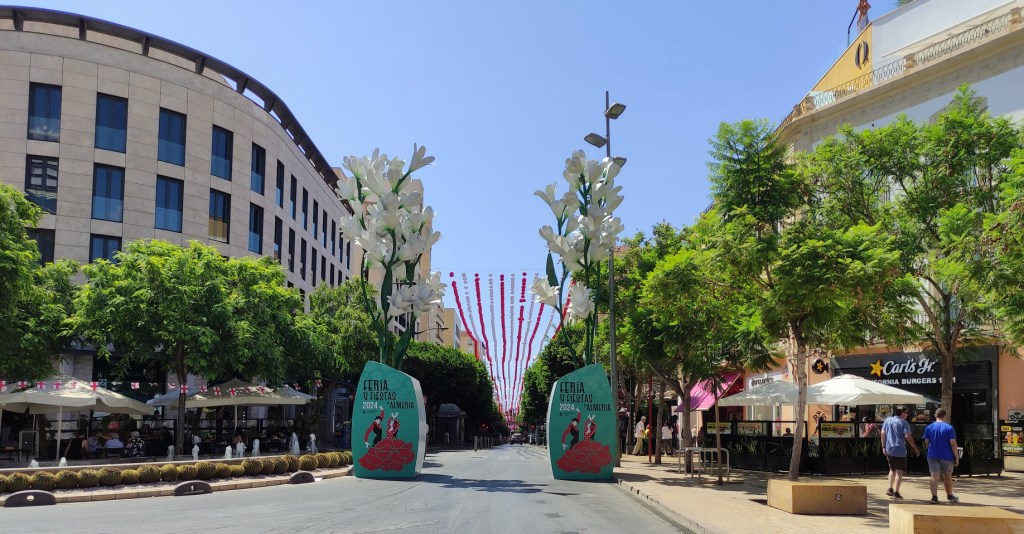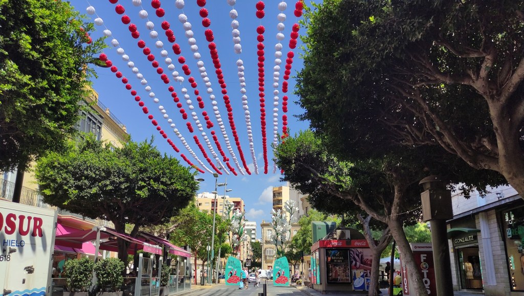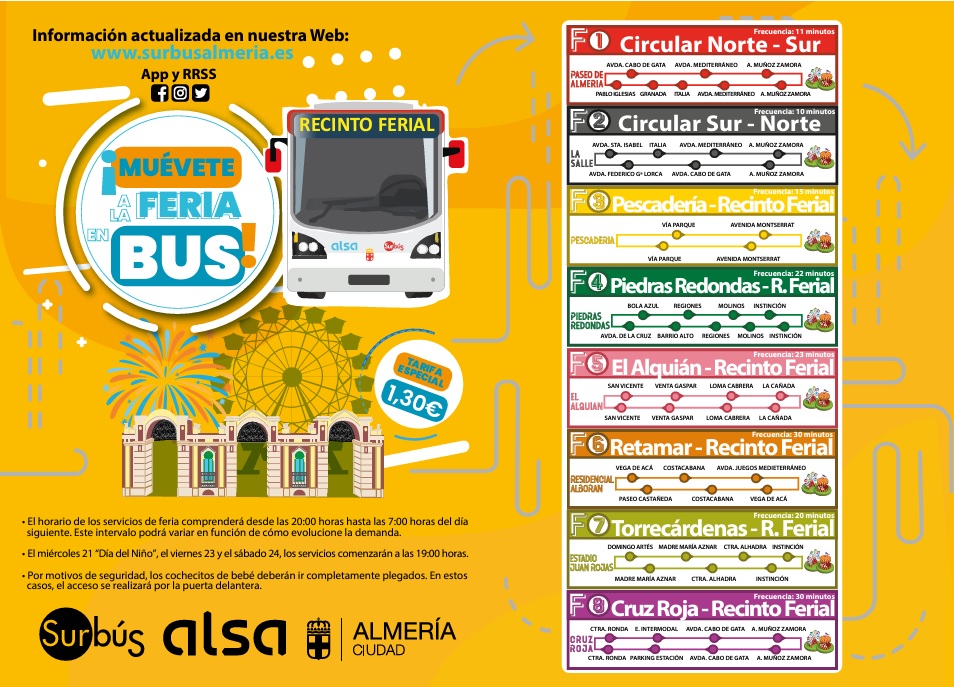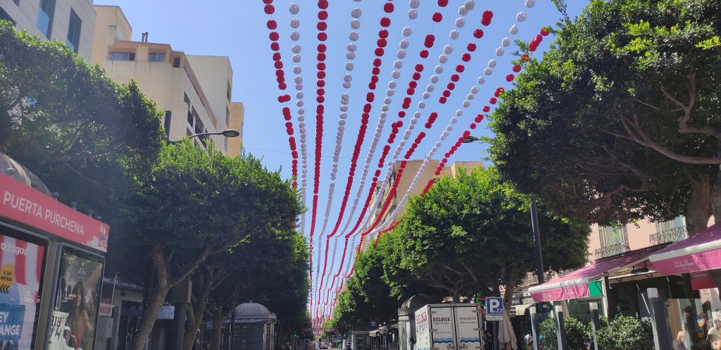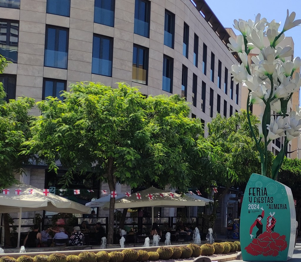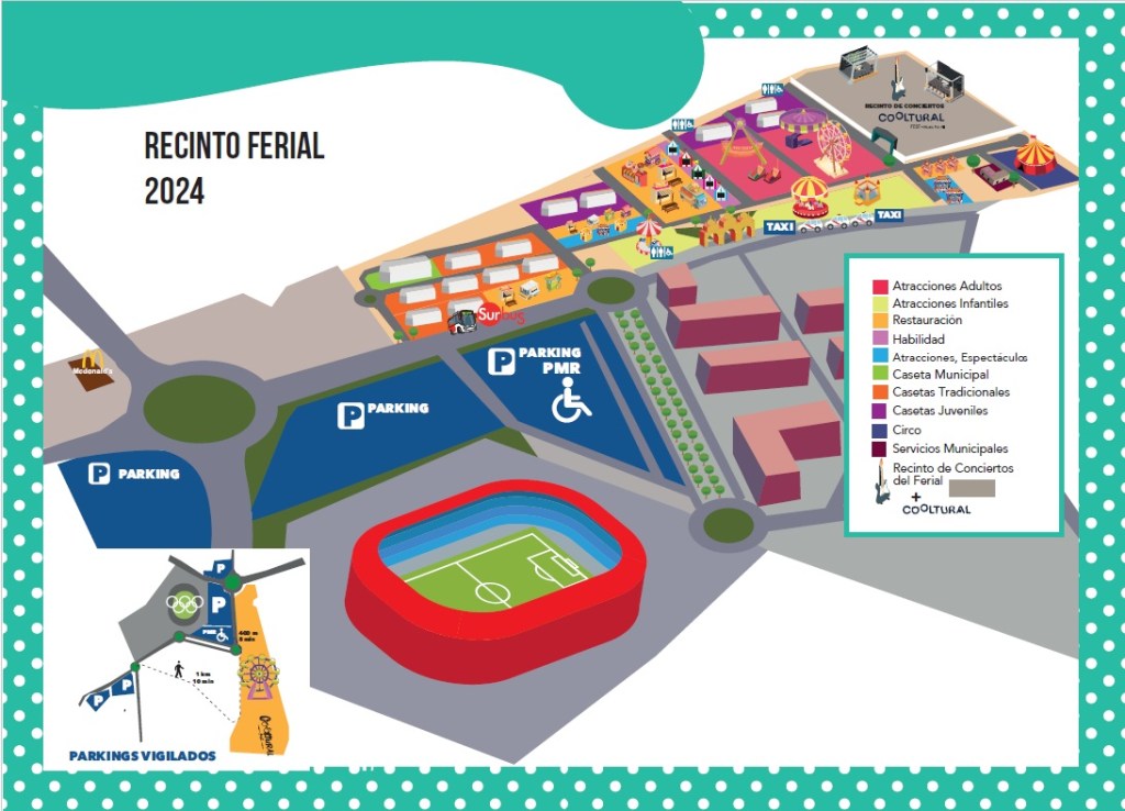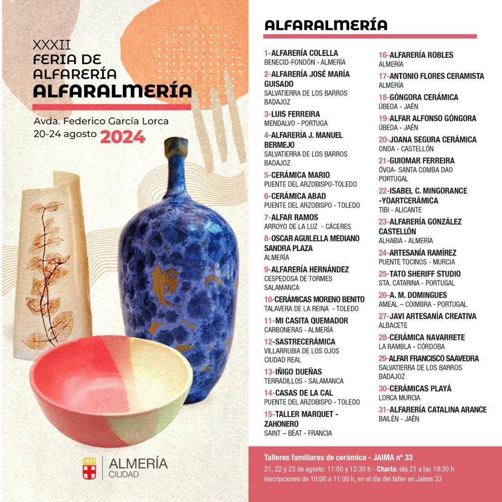 Fiesta de bienvenida, gratuita, del Cooltural Fest, en la Playa de Las Almadrabillas, junto al Cable Inglés.- Fotos JOMARO. (Clic sobre la imagen para ampliar)Cartel y programación taurina.- Foto JOMARORelación de alfareros representados en Alfaralmería.Detalle de los servicios de autobuses a la Feria.Distribución del recinto ferial 2024.Almería de rojo y blanco, nuestros colores como ciudad. La Puerta Purchena, portada a la feria del mediodía, y el Paseo de Almería, luce con farolillos que ponen el aire festivo. Bajo ellos se celebrará la procesión de alabanza, el domingo, día 25, con la imagen de la patrona, la Virgen del Mar.- Fotos JOMARO (Clic sobre la imagen para ampliar)Carteles de la feria distribuidos por diferentes espacios urbanos de la ciudad.- Fotos JOMARO (Clic sobre la imagen para ampliar)Preparativos de la feria. Taller de restauración y pintado de los gigantes y cabezudos, y primeros montajes de casetas en el recinto ferial.- Fotos JOMARO (Clic sobre la imagen para ampliar)Paradas de los autobuses que prestarán el servicio al recinto ferial desde distintos barrios.- Fotos JOMARO (Clic sobre la imagen para ampliar)Los feriantes han estrenado nuevo aparcamiento en la reciente ampliación del recinto ferial.- Fotos JOMARO (Clic sobre la imagen para ampliar)