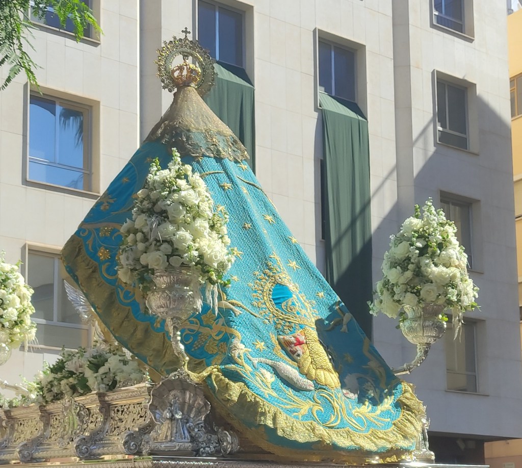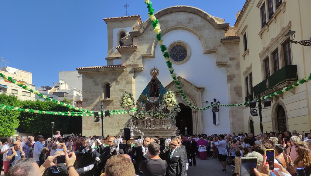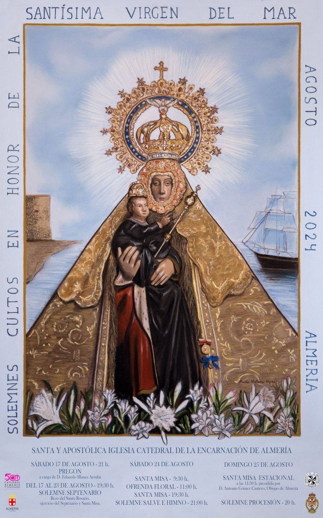 Cartel oficial y programa de los actos religiosos, en honor de la patrona, la Virgen del Mar. (Clic sobre la imagen para ampliar)La imagen de la Patrona camino de la catedral. Desde su santuario, la Virgen del Mar, en sencillo, pero numeroso cortejo, desfiló por el casco antiguo para el primer templo almeriense, que celebra su 500 aniversario y el Año Jubilar. Allí permanecerá hasta el 25 de agosto, cuando tenga lugar la procesión de alabanza.- Fotos JOMARO. (Clic sobre la imagen para ampliar)