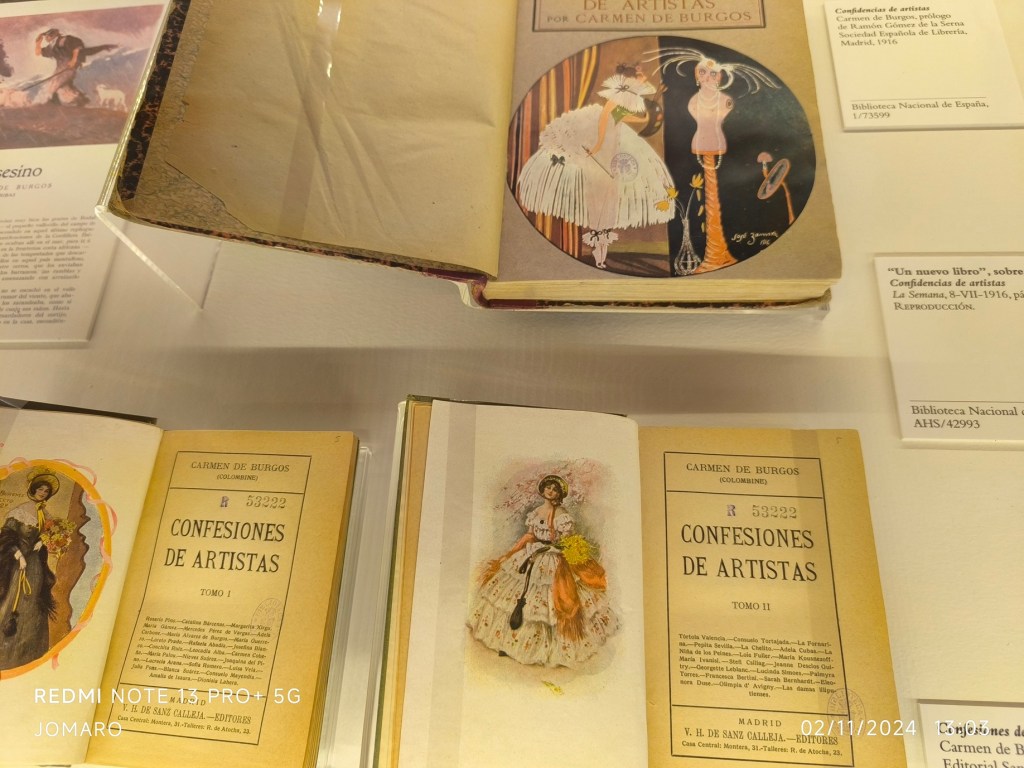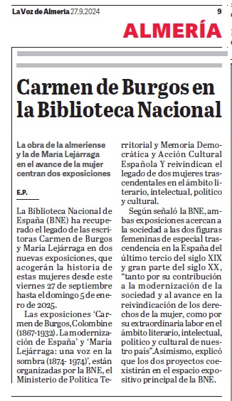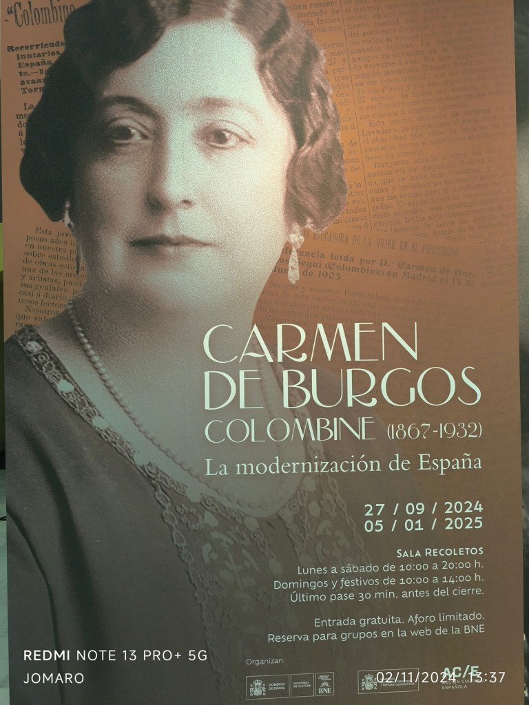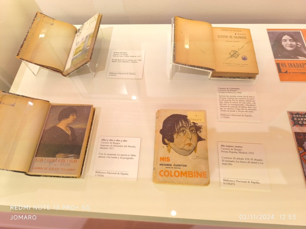 La exposición está organizada conjuntamente por la Biblioteca Nacional de España, el ministerio de Política Territorial y Memoria Democrática y Acción Cultural Española (ACE). La muestra “Carmen de Burgos, Colombine (1867-1932). La modernización de España”, coincide con la de “María Lejárraga: una voz en la sombra (1874-1974)”. Ambas iniciativas “acercan a dos figuras femeninas de especial trascendencia en la España del último tercio del siglo XIX y gran parte del siglo XX, tanto por su contribución a la modernización de la sociedad y al avance en la reivindicación de los derechos de la mujer, como por su extraordinaria labor en el ámbito literario, intelectual, político y cultural de nuestro país”. A la inauguración, que tuvo lugar el 26 de septiembre de 2024, asistieron, entre otras personalidades, la presidenta del Consejo de Estado, Carmen Calvo; el secretario de Estado de Memoria Democrática, el almeriense Fernando Martínez López; y la directora general del Libro, del Cómic y de la Lectura, María José Gálvez.