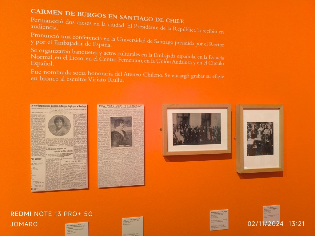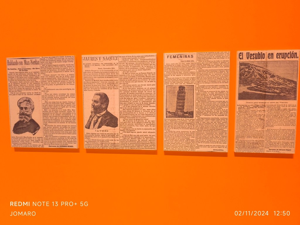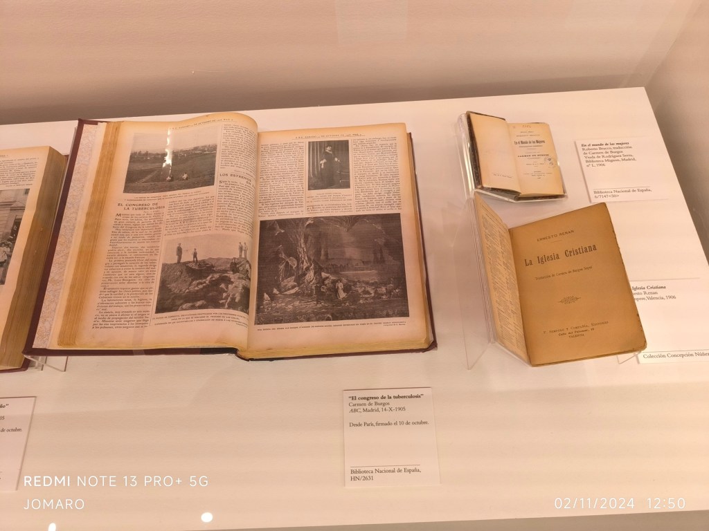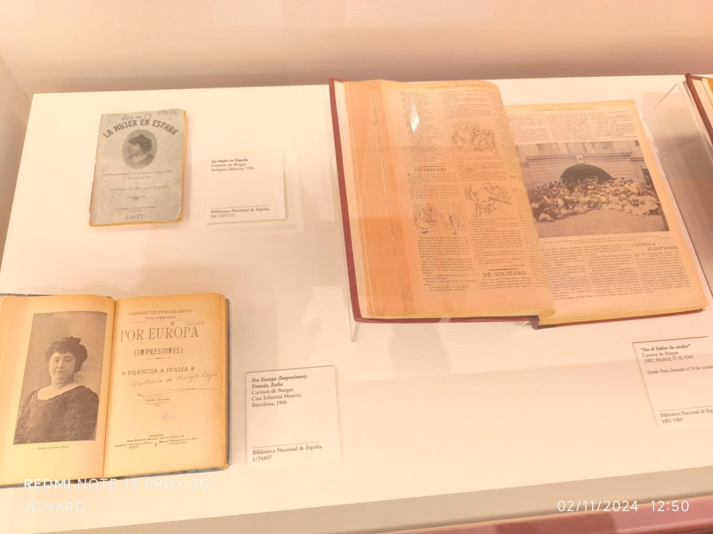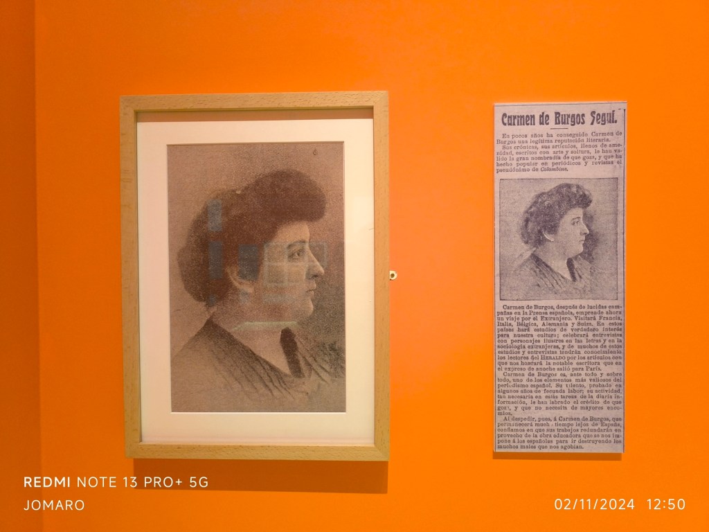 La agencia ‘EFE’, como reflejan varios periódicos, entre ellos ‘ABC’ y ‘eldiario.es’, destaca que “la muestra se abre con la imagen de Carmen de Burgos, reconocida como la primera periodista española en 1903 en el Diario Universal, donde firmaba con el seudónimo de Colombine que la hizo popular. Años más tarde, volvió a ser pionera en 1909 como corresponsal de guerra en Melilla. A partir de ahí, la exposición comisariada por Concepción Núñez Rey, detalla la vida de una mujer que utilizó su pluma para imbuir con sus artículos un pensamiento modernizador, de progreso e igualdad. ‘Un mundo pasional con ansias de libertad’, ha reseñado la comisaria”.