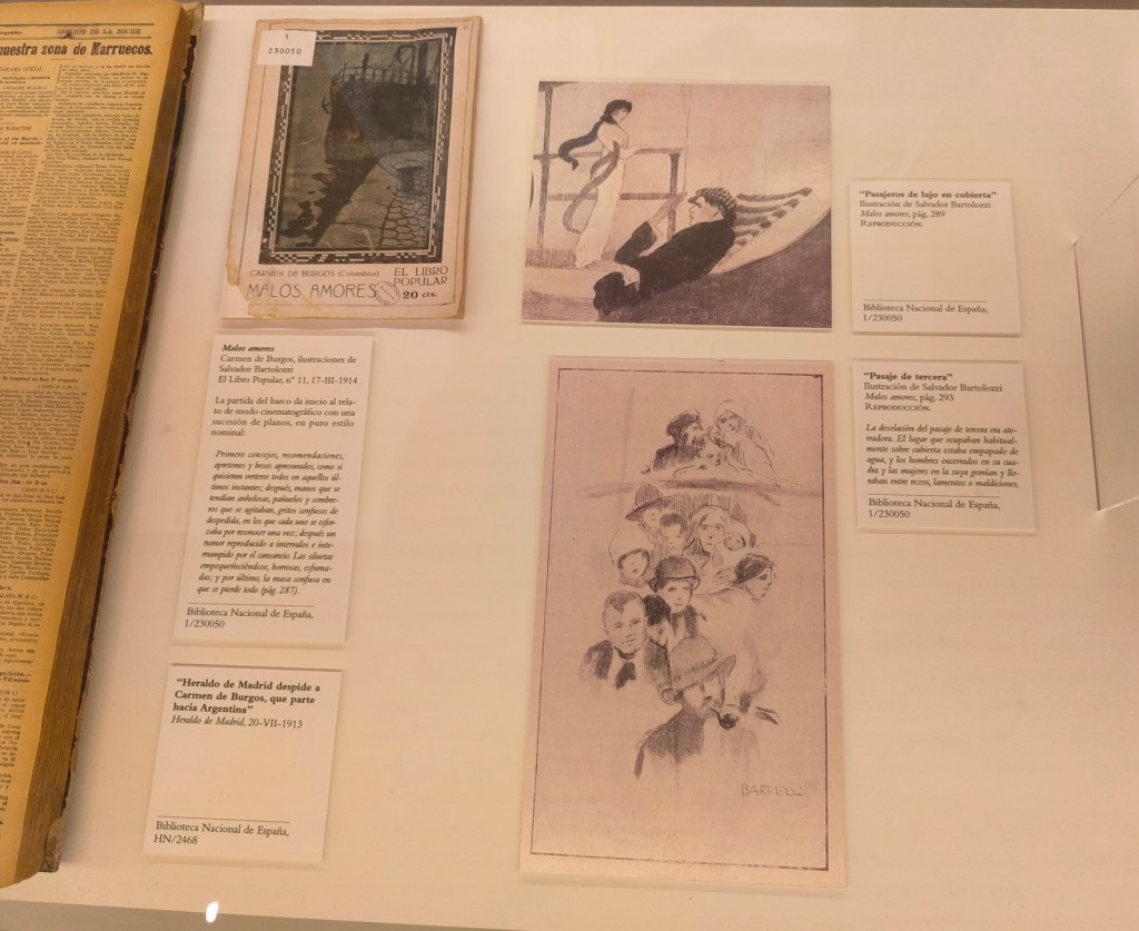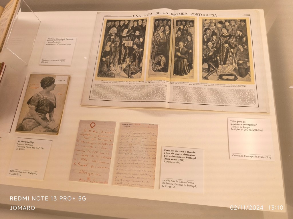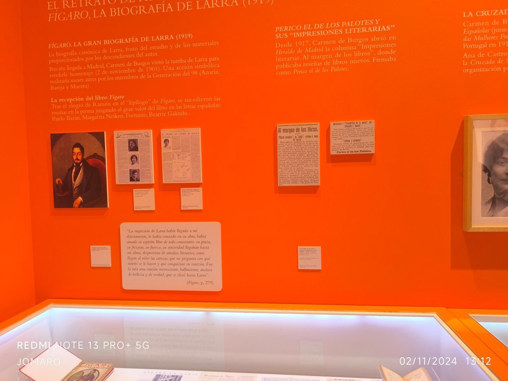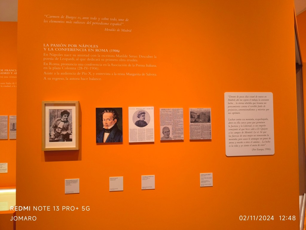 La agencia ‘EFE’, como reflejan varios periódicos, entre ellos ‘ABC’ y ‘eldiario.es’, destaca que “la muestra se abre con la imagen de Carmen de Burgos, reconocida como la primera periodista española en 1903 en el Diario Universal, donde firmaba con el seudónimo de Colombine que la hizo popular. Años más tarde, volvió a ser pionera en 1909 como corresponsal de guerra en Melilla. A partir de ahí, la exposición comisariada por Concepción Núñez Rey, detalla la vida de una mujer que utilizó su pluma para imbuir con sus artículos un pensamiento modernizador, de progreso e igualdad. ‘Un mundo pasional con ansias de libertad’, ha reseñado la comisaria”.
