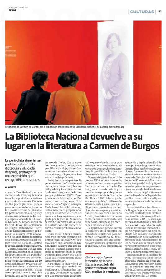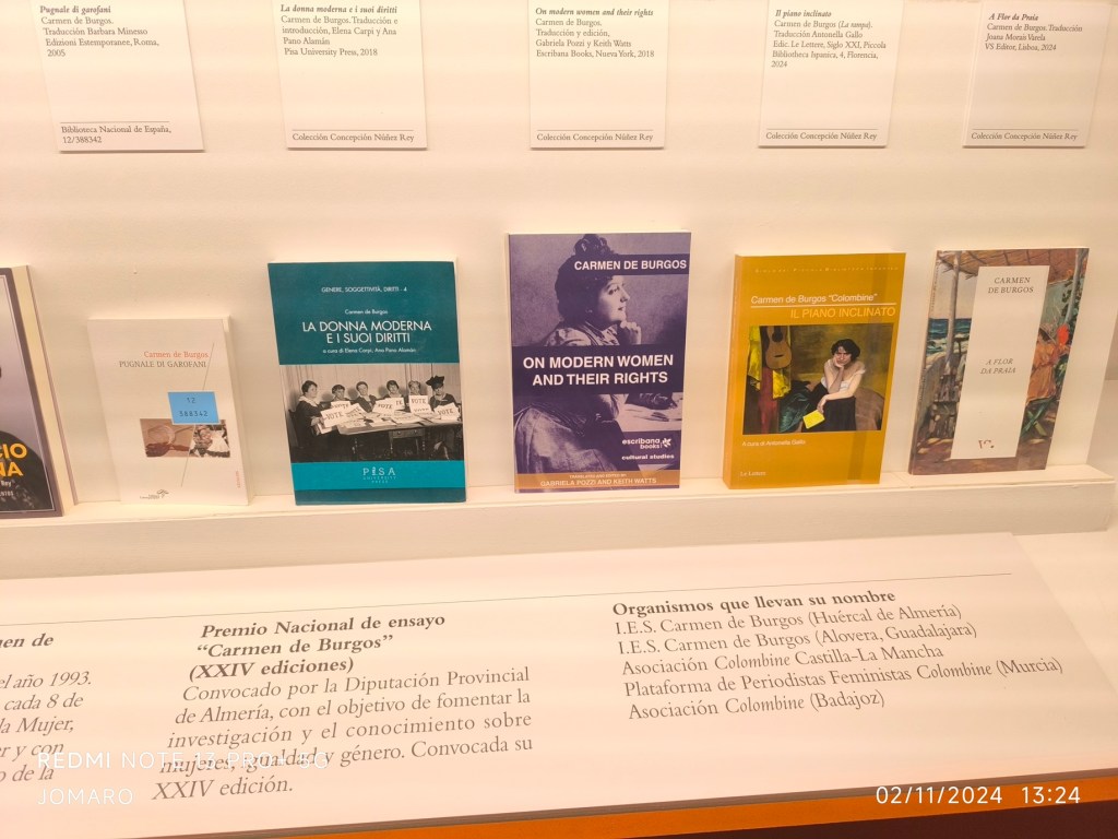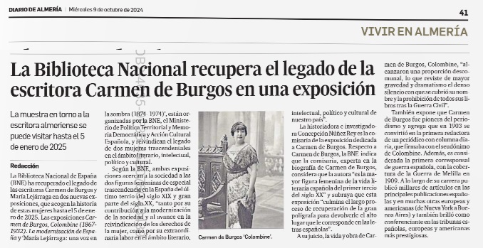 Concepción Núñez Rey, quien ha consagrado toda su vida académica y profesional, casi medio siglo de su trayectoria, a Carmen de Burgos, es la comisaria de la exposición que hasta el 2 de marzo de 2025 (estaba previsto hasta el 5 de enero, pero fue prorrogada, dado el éxito alcanzado) puede visitarse en la Biblioteca Nacional de España (BNE). Su riguroso e intenso trabajo elaborando y ejecutando este exhaustivo proyecto, que le ha llevado más de un año de dedicación, teniendo que resumir muchos de los aspectos biográficos y creativos de Colombine, ha dado sus frutos con una presentación al público excelente. Es, sin duda, uno de los mayores exponentes, hasta ahora, para rescatar definitivamente la enorme figura y producción de la periodista almeriense. La propia directora general del Libro, del Cómic y de la Lectura, María José Gálvez, reconoció el pasado 18 de noviembre de 2024 que, a través de esta iniciativa, ha llegado a “conocer, admirar y considerar” a Carmen de Burgos, que fue “arrancada de las páginas de la historia” por la censura franquista. Gálvez se ha comprometido a que esta exposición sea “un punto y seguido” para que quien “fue la primera en muchas cosas” tenga “la importancia que merece en nuestro tiempo”.