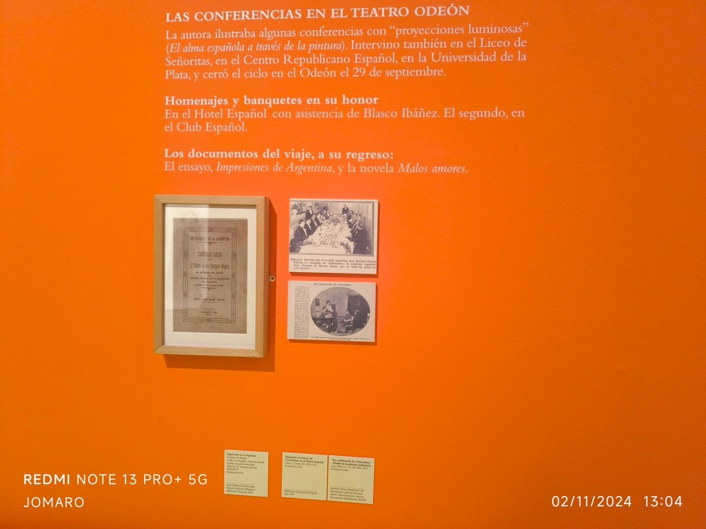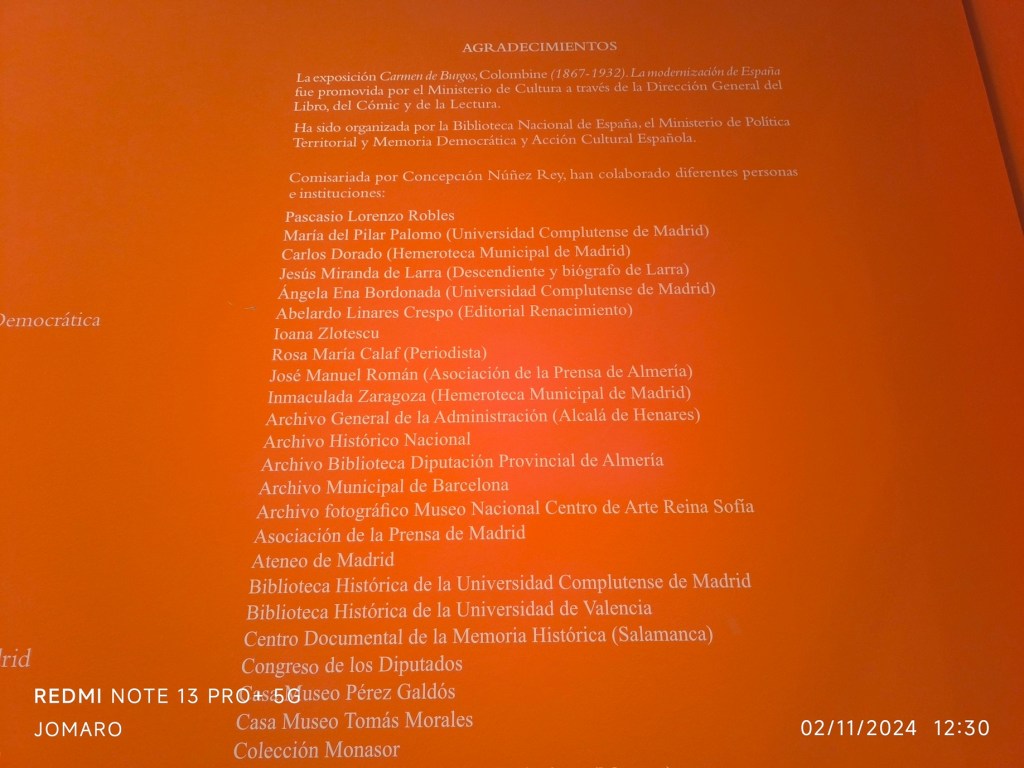 El lunes, 10 de febrero de 2025, a falta de tres semanas para clausurar la exposición –2 de marzo, después de prolongarse dos meses-, en el marco del salón de actos de la Biblioteca Nacional tuvo lugar una conferencia con el mismo título que la muestra –“Carmen de Burgos, Colombine (1867 – 1932). La modernización de España”-, a cargo de su comisaria, Concepción Núñez Rey. La sala llena, en directo, y más de medio centenar de personas siguiéndola por YouTube, donde lleva ya cerca de 932 visualizaciones (26 de febrero de 2025).