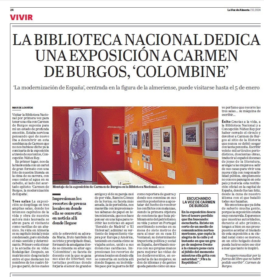 En un artículo de opinión que difundió ‘La Voz de Almería‘, la escritora Mar de los Ríos, subraya que “visitar la Biblioteca Nacional por primera vez para tener una cita con Carmen de Burgos suponía para mí un estado de profunda emoción. Estaba nerviosa pensando qué de nuevo iba a descubrir en esta semblanza de Carmen que no nos hubiera dicho ya la comisaria de la exposición a través de sus textos, Concepción Núñez Rey”. De los Ríos da “gracias a la vida, a la Biblioteca Nacional” y a la coordinadora de la muestra, “por devolver al sitio de la Historia que nunca debió sesgar con tanta ponzoña. Escribir veinte mil artículos periodísticos, doscientas obras, traducir al español docenas de joyas de la literatura, arengar a las mujeres a salir de sus casas para vivir una nueva vida con responsabilidad pública, simplemente no conoce parangón en este país y merecía esta restitución oficial en la capital de España, donde fue tan feliz, desde la cuna de nuestro idioma con el que batalló todas sus hazañas”. Finalmente, Mar de los Ríos, hace un llamamiento a las autoridades para que en el próximo año “tengan a bien en sus presupuestos acordar el traslado de esta exposición a su ciudad natal como se merece, en un sitio holgado donde pueda lucirse entre ese olor a mar que tanto le inspiró”.