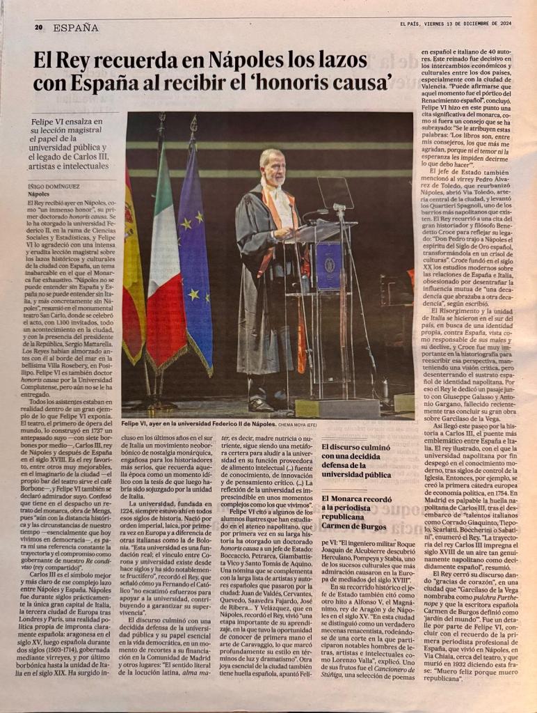 La reseña destaca cómo el rey cerró su discurso, «dando ‘gracias de corazón’, en una ciudad que ‘Garcilaso de la Vega nombraba como pulchra Parthenope y que la escritora española Carmen de Burgos definió como ‘jardín del mundo’”. El periodista, Íñigo Domínguez, remarca que “fue un detalle por parte de Felipe VI, concluir con el recuerdo de la primera periodista profesional de España, que vivió en Nápoles, en Vía Chiaia, cerca del teatro, y que murió en 1932 diciendo esta frase: ‘Muero feliz porque muero republicana’”.