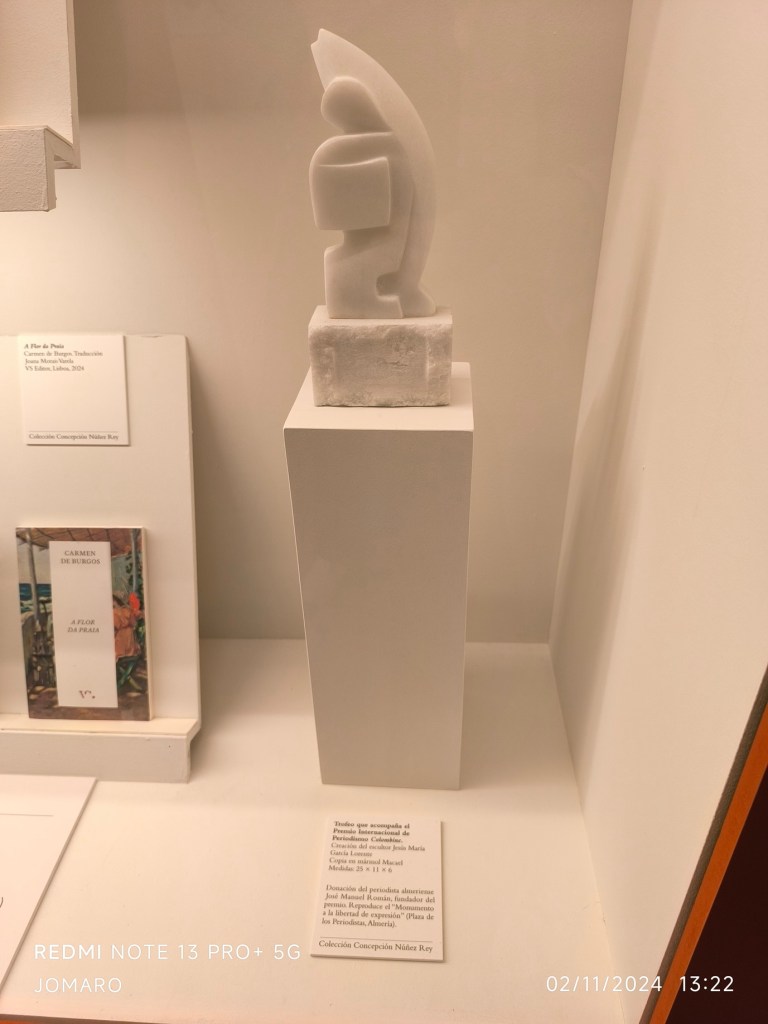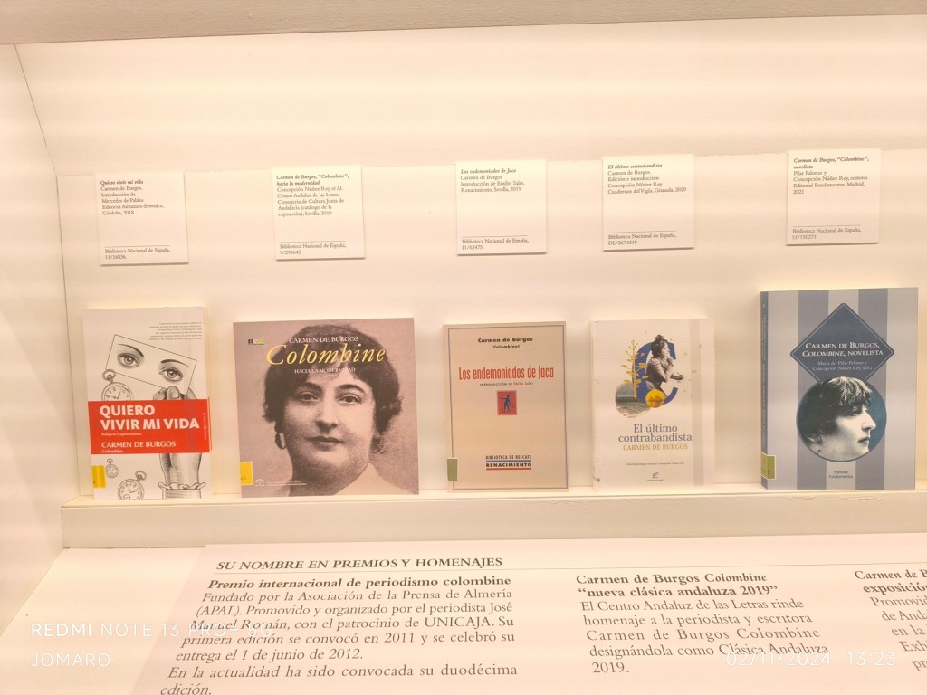 Precisamente, el último capítulo, que cierra la exposición, recoge la labor de investigadores que han recorrido hemerotecas y archivos europeos y americanos para rescatar a Carmen de Burgos del olvido. Muestra una serie de reediciones de sus novelas, estudios sobre su figura, traducciones y otros homenajes que han realizado diferentes instituciones. Hay una especial relevancia para el Premio Internacional de Periodismo Colombine, que convoca la Asociación de Periodistas – Asociación de la Prensa de Almería (AP-APAL), y que acaba de cerrar su duodécima edición con el patrocinio, desde sus inicios (2011), de la Fundación Unicaja, y de la empresa almeriense Grupo Cosentino, en este último año. Cierra la muestra una reproducción en mármol de Macael del trofeo que recibe el ganador del certamen. Elaborado por la Escuela del Mármol de Fines, reproduce el monumento a la libertad de Prensa del escultor Jesús María García Lorente, donado por la AP-APAL a la ciudad de Almería, que se erige en la plaza de los Periodistas.