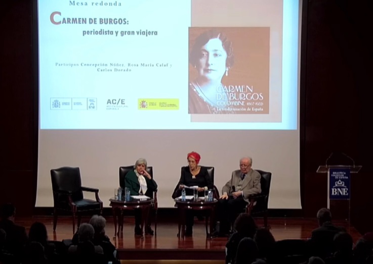 Como actividad paralela a la exposición, en la misma BNE, se celebró, el 18 de noviembre de 2024, una interesante mesa redonda, «Carmen de Burgos: periodista y gran viajera«, donde participaron la comisaria del proyecto, Concepción Núñez Rey; la periodista Rosa María Calaf y Carlos Dorado, exdirector de la Hemeroteca Municipal de Madrid. Calaf confesó que descubrió a Carmen de Burgos cuando su padre, en 1962, le regaló ‘Mis viajes por Europa’. La ex corresponsal de TVE quedó fascinada de cómo una mujer, a través de sus relatos, “nos contaba cómo era el mundo, ya que hasta entonces lo habían hecho solo hombres”. “Desde ese momento –comentó Rosa María– me convierto en una fanática viajera y empiezo a estudiar periodismo por Carmen de Burgos, su figura cala en mí”. Ese ánimo viajero le ha llevado a visitar 184 países y “solo me faltan doce”. Reivindicó la figura de Colombine por “su enorme importancia para el periodismo y el feminismo”, lo que debería tenerse en cuenta para estudiarse en los planes académicos de las enseñanzas medias y universitarias, sobre todo en las relacionadas con las ciencias de la información.