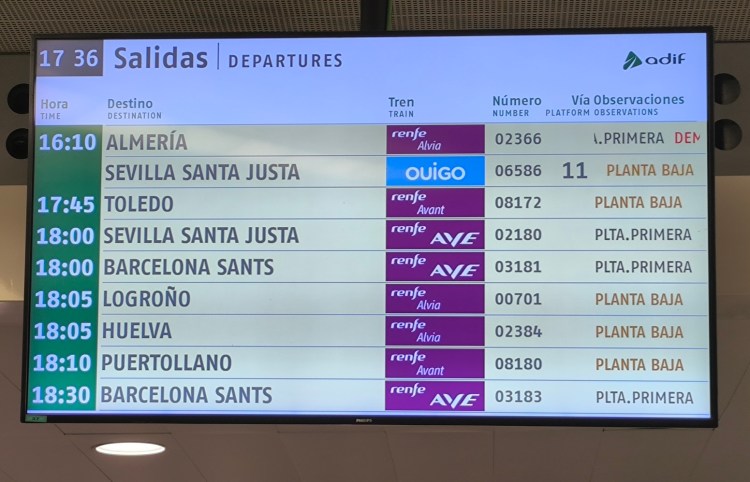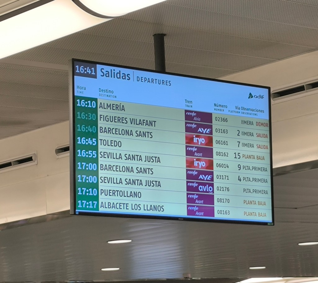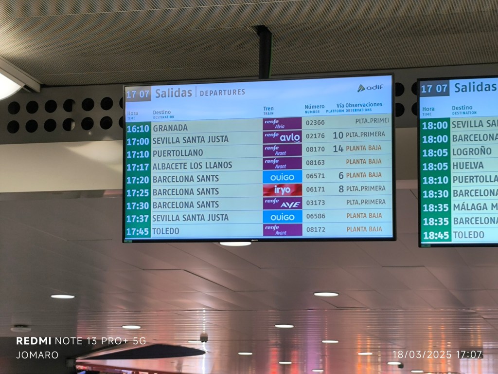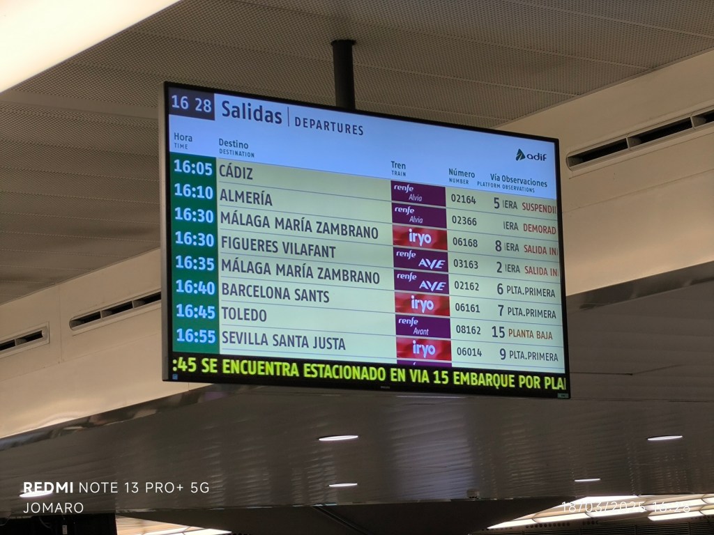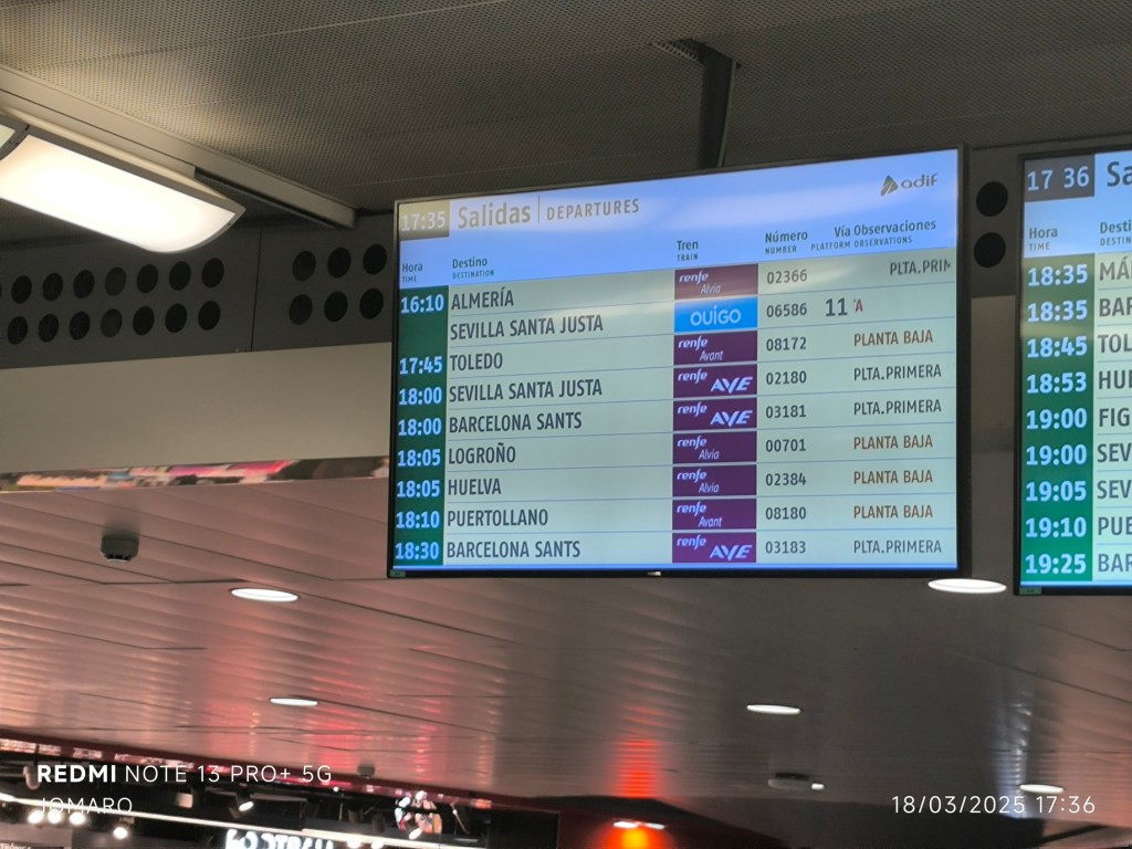 NOTA.- La imagen destacada de portada corresponde a uno de los paneles informativos de Atocha. Eran las 17:36 h. y aún no tenía vía asignada, ni anuncio de salida, el Alvia con destino a Almería y Granada, que, en principio, debería haber partido a las 16:10 h..- Foto JOMARO.