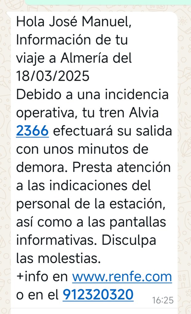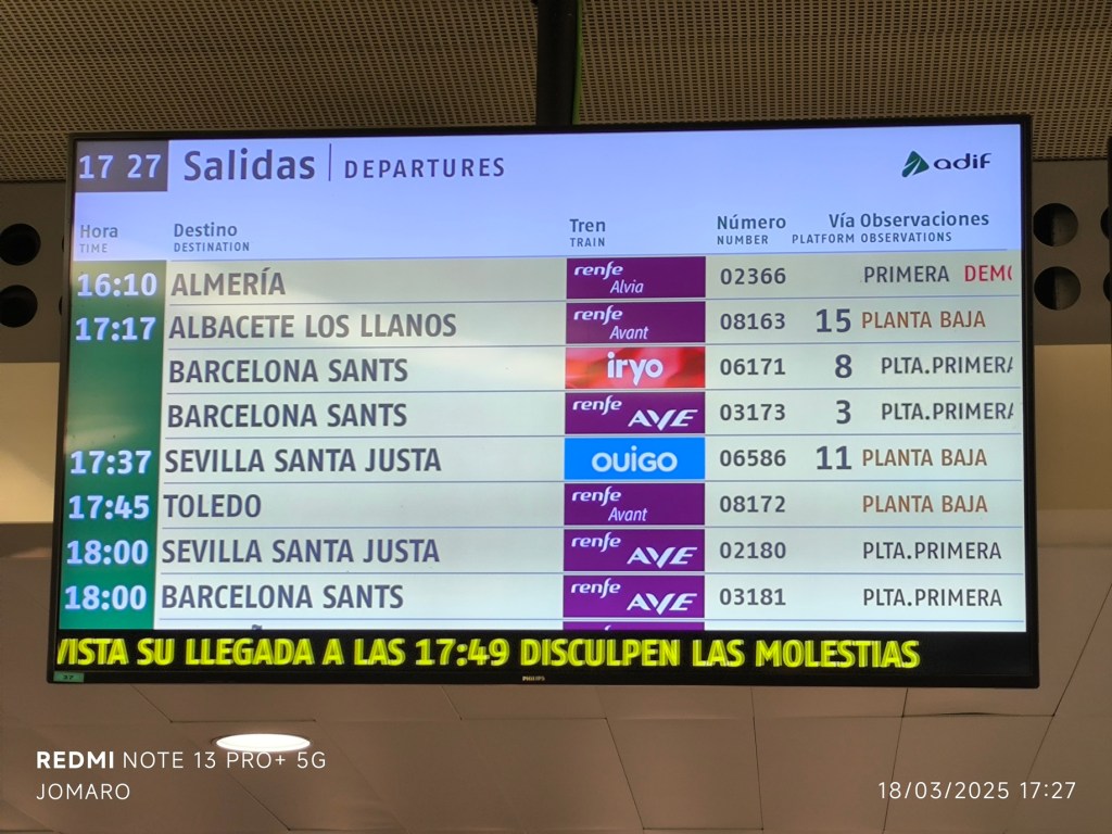 Martes, 18 de marzo de 2025. Estación de Atocha – Almudena Grandes. Pasamos control de equipaje y pertenencias y nos plantamos en el vestíbulo desde donde se embarca para acceder a las vías y al tren que corresponde a cada billete expedido. En nuestro caso, el Alvia 2366 de Madrid a Almería y Granada. Lo hacemos media hora antes de la fijada para la salida, que es a las 16:10 h. En el recinto, apenas 4 asientos, para cientos de personas que esperan ante las pantallas que suministran información permanentemente. Nuestro tren se queda huérfano, sin vía, mientras vemos esfumarse los minutos. Pasa la hora de la marcha y es cuando anuncian por megafonía que hay “demora”, haciendo hincapié en que estemos pendientes del personal de Renfe (no hay nadie) y de los paneles electrónicos. A las 16:25 h., Renfe envía al móvil de los viajeros un escueto mensaje donde dice que el Alvia “efectuará su salida con unos minutos” de retraso. Reitera que prestemos atención “a las indicaciones del personal de la estación –insistimos, no hay-, así como a las pantallas informativas”.