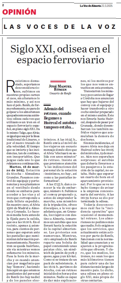 #BajoelManzanillo critica a Renfe, por la desconsideración y el caos generado en torno al tren Alvia Madrid – Almería y Granada, que, sin explicación alguna, salió con dos horas y dos minutos de retraso, la tarde del pasado martes, 18 de marzo de 2025. Motivo, ‘una incidencia operativa’. En Córdoba, transbordo a otro convoy similar, para seguir hasta Huércal- Viator, donde los autobuses llegaron también con demora para el traslado a la estación de la capital.