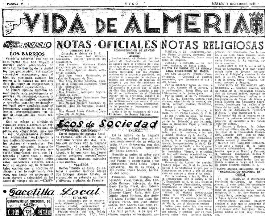 #BajoelManzanillo en diciembre de 1951 recogía la denuncia de vecinos de Almería sobre la presencia en los barrios de ‘animalitos, pequeños y grandes’ en las puertas de las casas, el ‘tendido de ropas de acera a acera’, y el ‘encendido de fogones en plena vía’, solicitando ‘una adecuada inspección municipal’